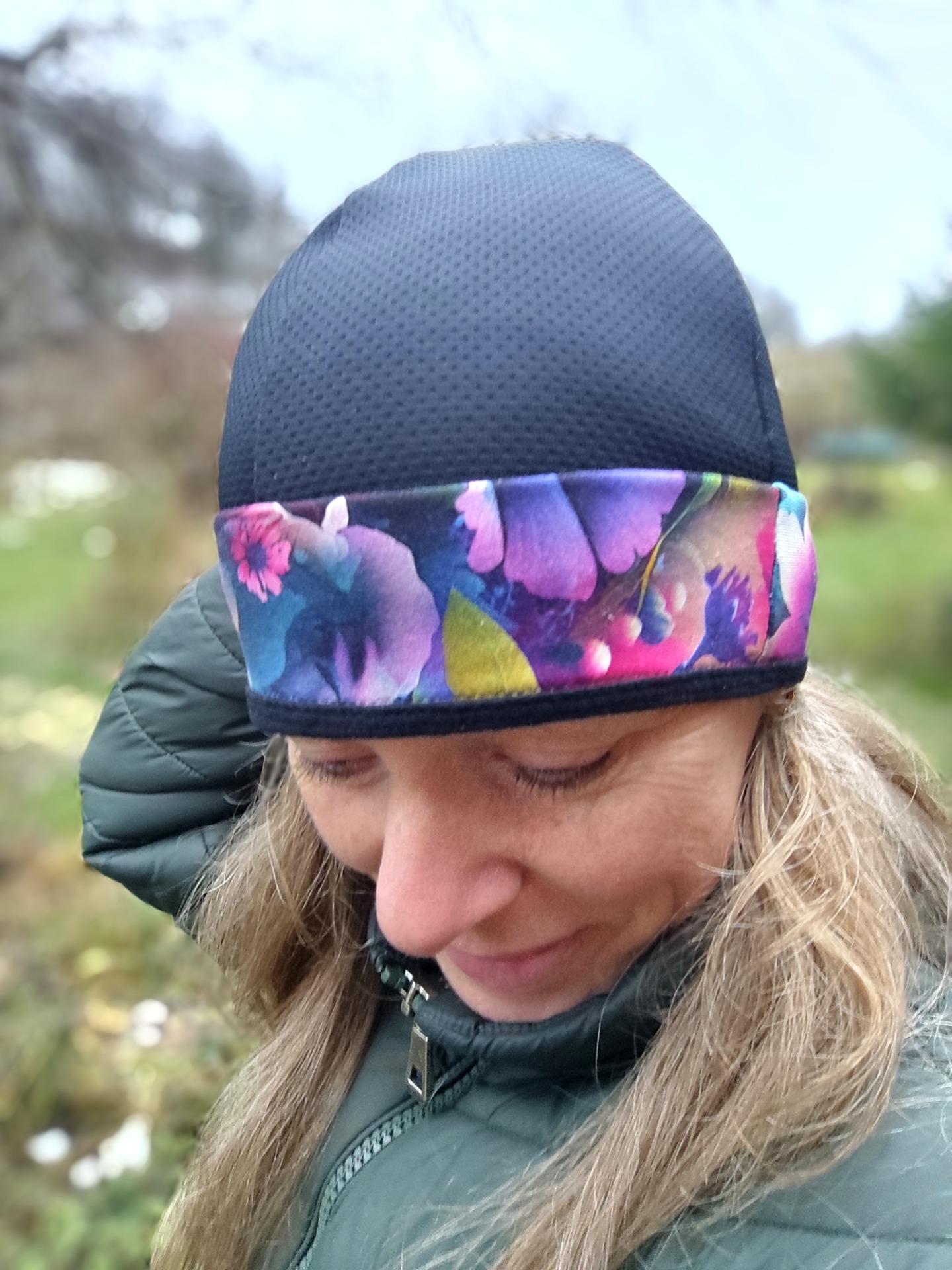Klasická uzavřená čepice, co hebce obejme hlavu. Lehká z funkčního materiálu s lemem z pružné teplákoviny, takže na čelo bude příjemně teplo.