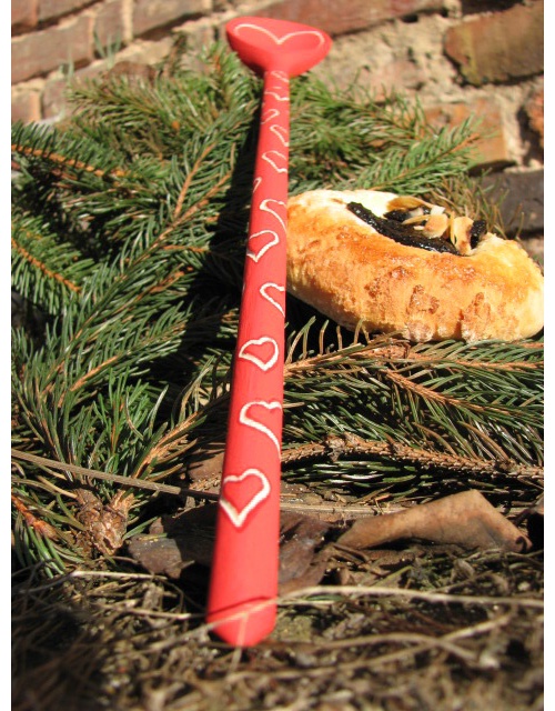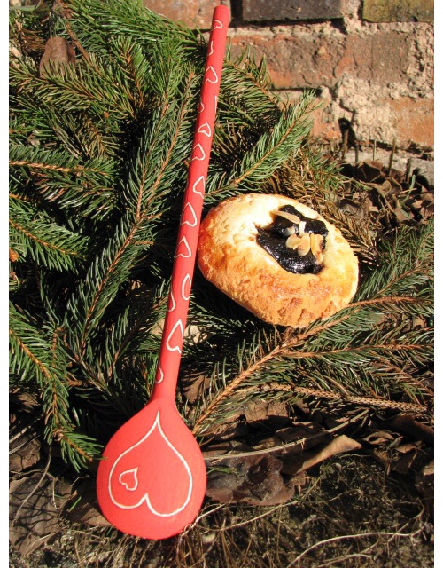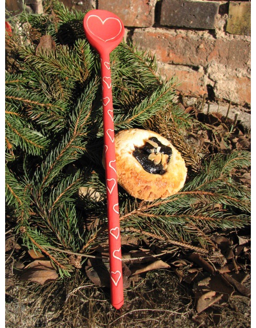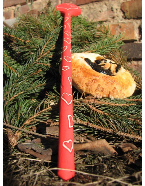 Dřevěná vařečka zdobená barvením, ručním vyřezáváním, lakovaná.