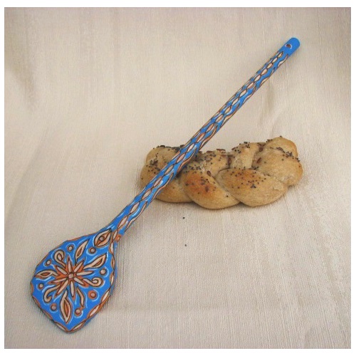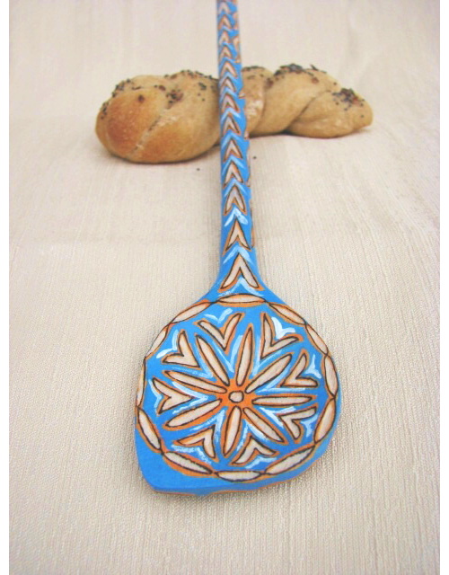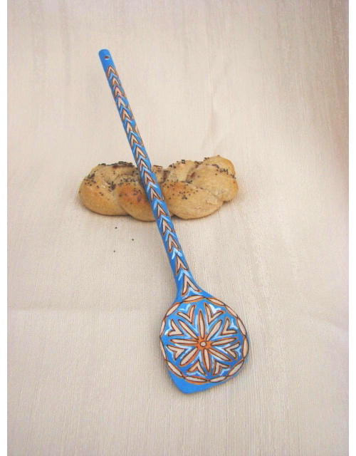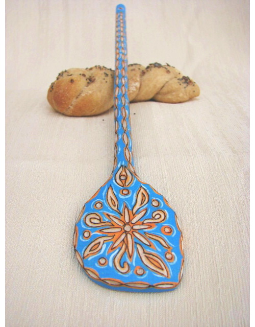 Dřevěná vařečka zdobená barvením, ručním vyřezáváním, lakovaná.