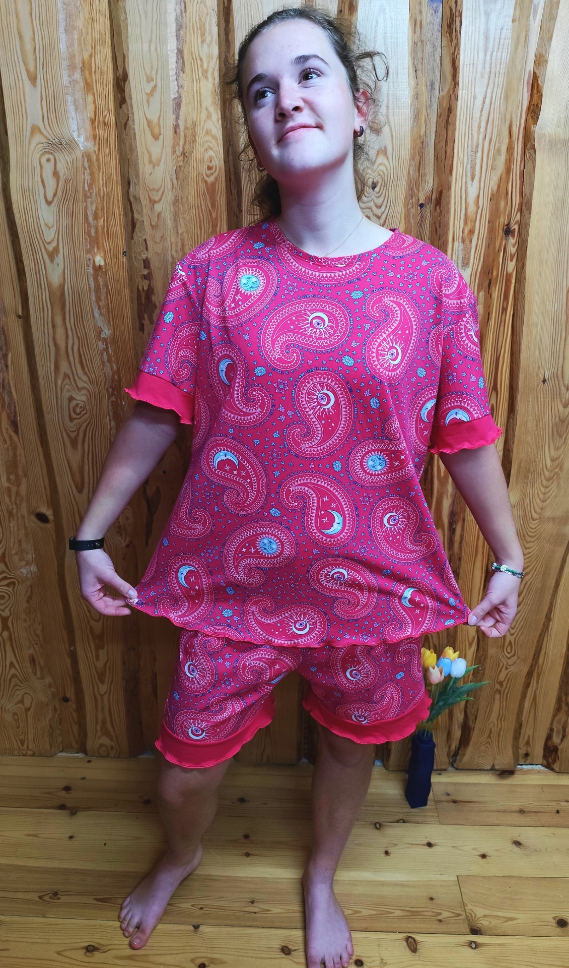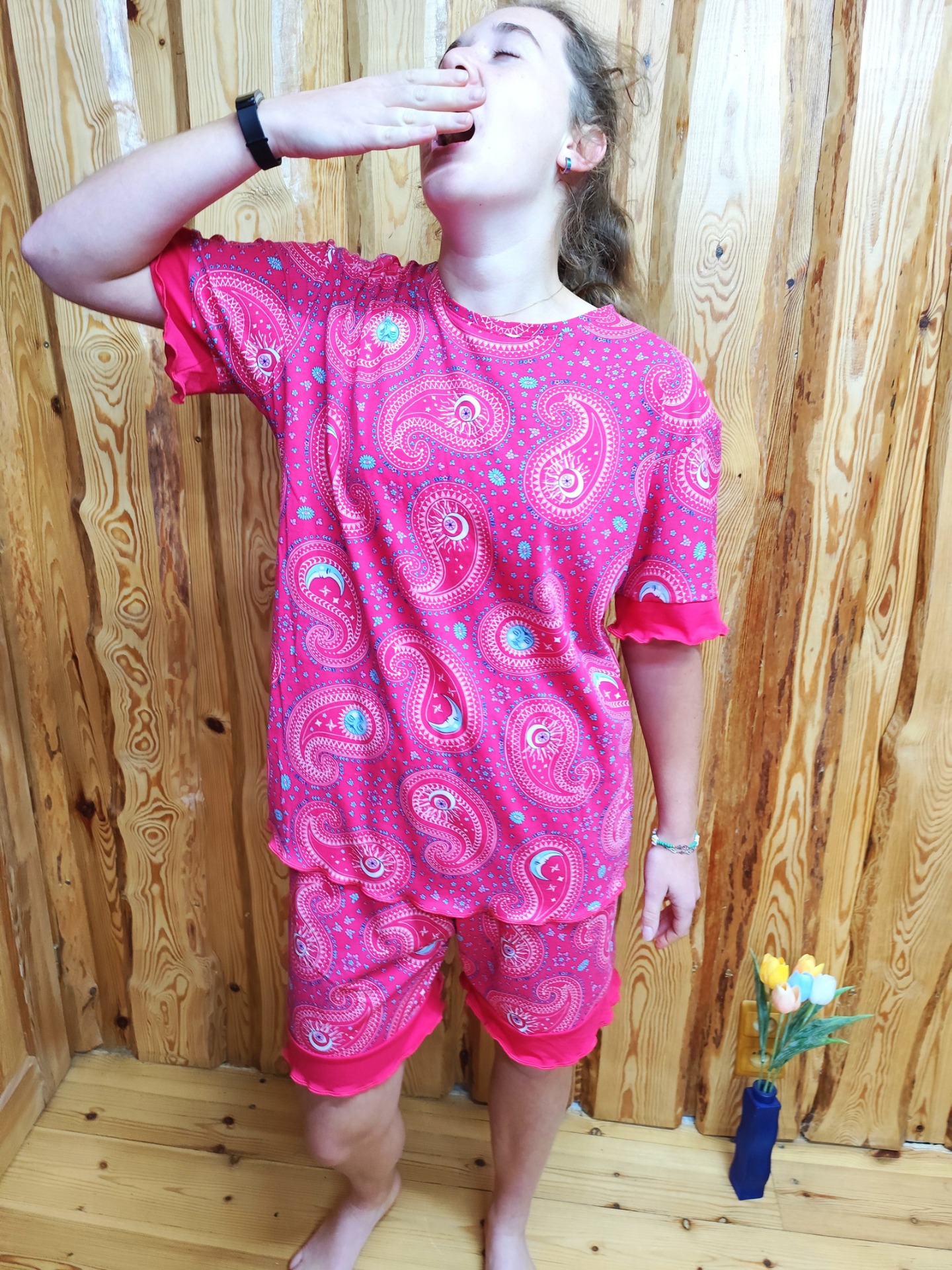 Rukávy a nohavičky lemované jednobarevnou růžovou, guma v pase nastavitelná.