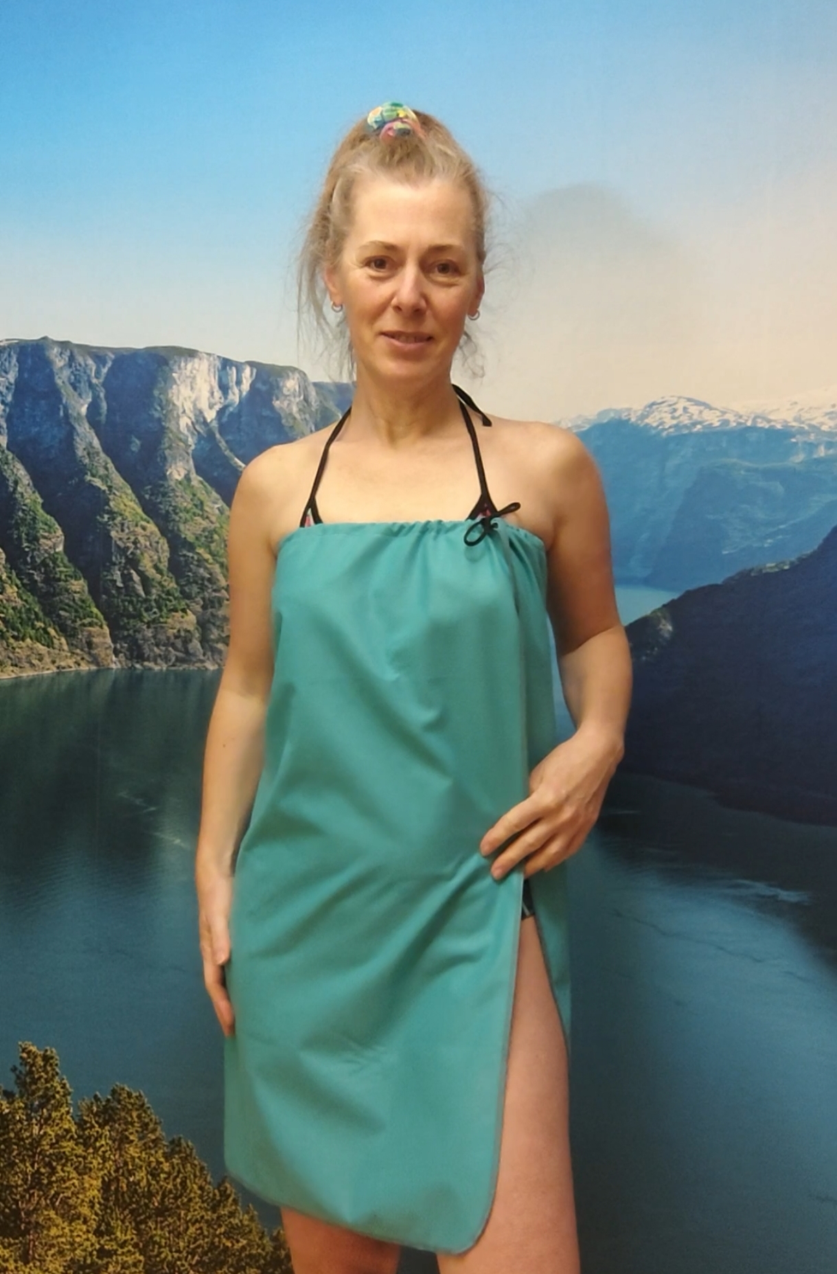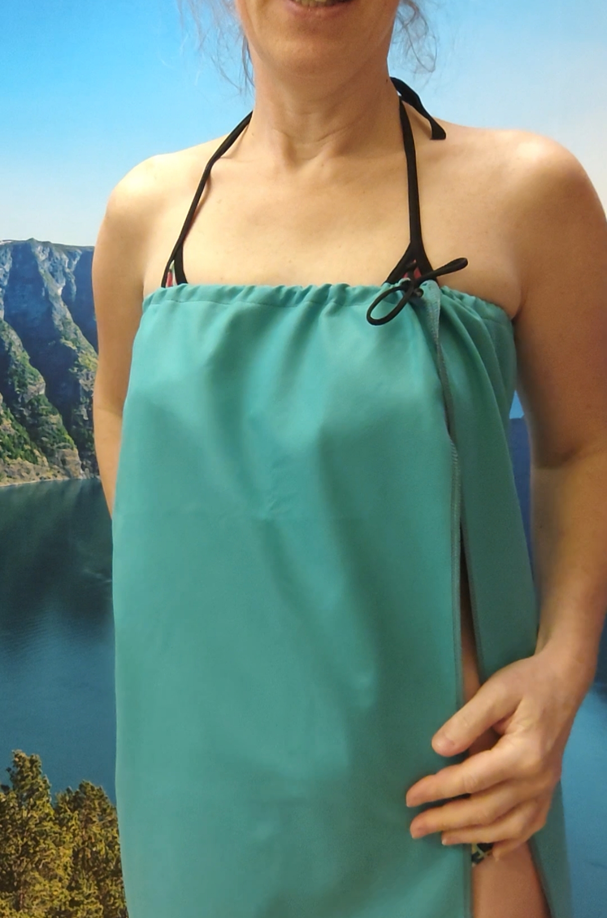Ručnik díky zavázání drží v pase, nebo zakryje střed těla.