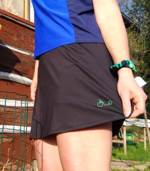 mírné áčko s rozparkem, kraťasy jsou v sukni všity, jednobarevná funkční látka, sukně opatřena výšivkou koloběžky v zelené barvě