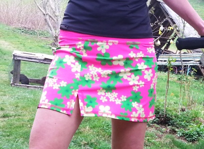 Sukně je z květinové látky, pas a případné kraťasy z jednobarevné růžové plavkoviny.