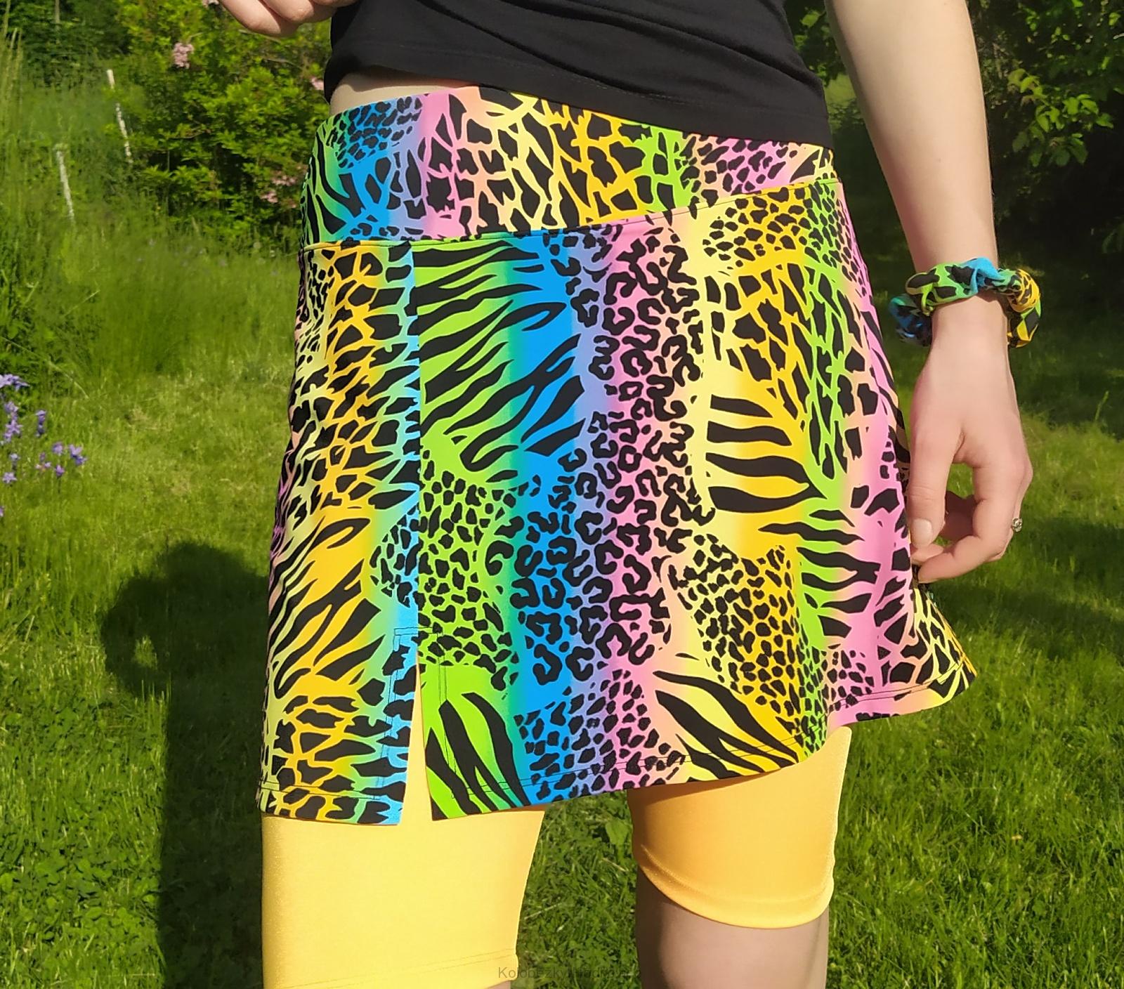 Sportovní sukně s širším pohodlným pasem, vzor šelma, kraťasy nad kolena z jednobarevné sportovní látky