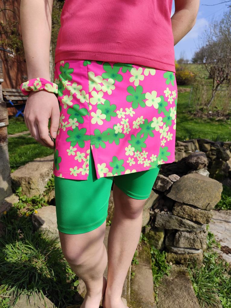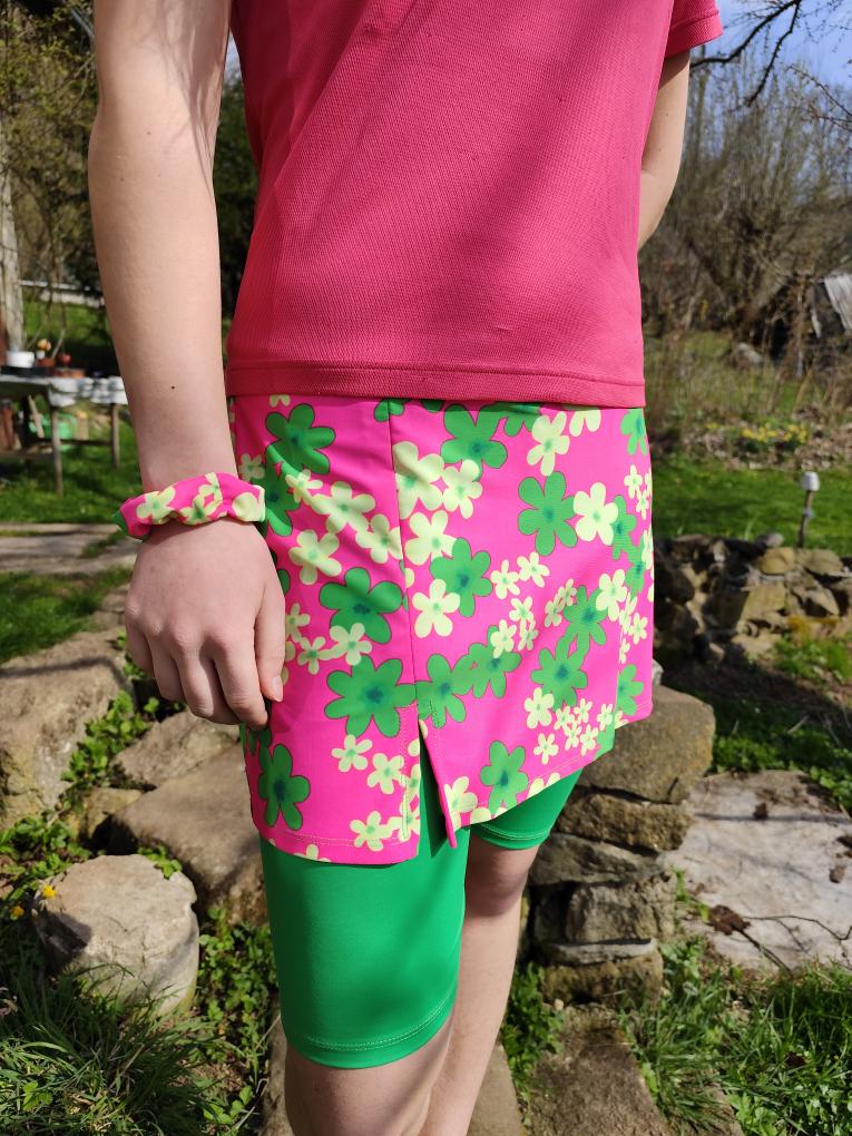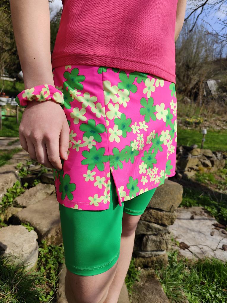 Sportovní sukně s širším pohodlným pasem, vzor Zelená kvítka na růžové, kraťasy nad kolena z jednobarevné sportovní látky