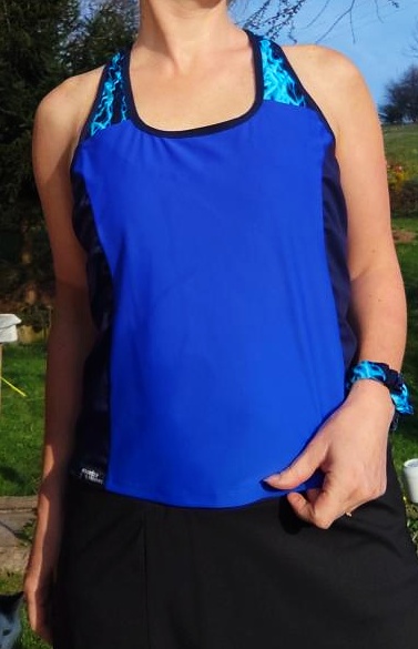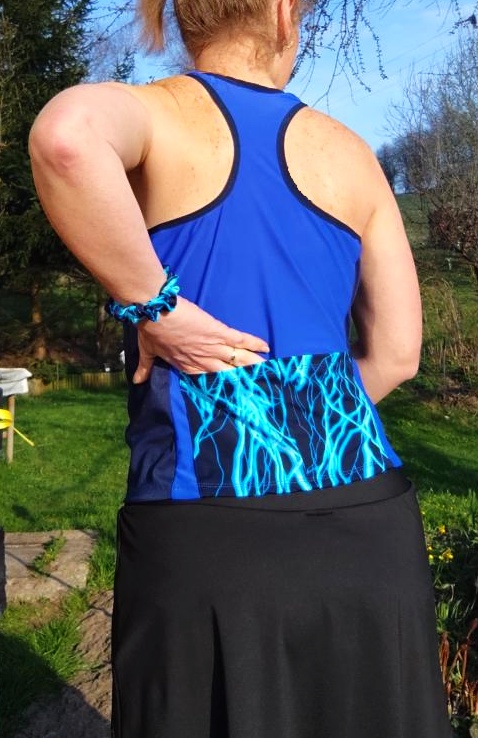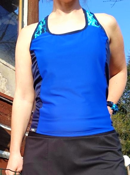 Sportovní tílko z funkčních materiálů, kombinace jednobarevné modré, modrých blesků a tmavě modrého spideru na bočních dílech