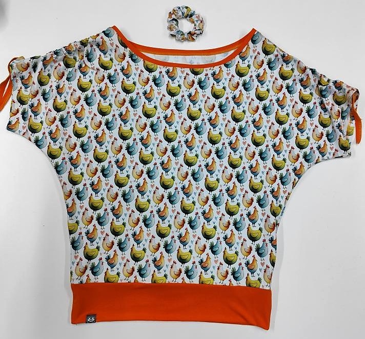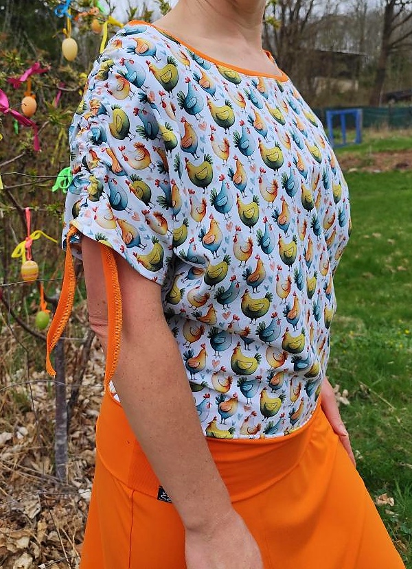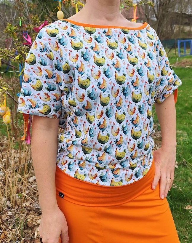 Tričko se stahovacím krátkým rukávem z bavlněného a viskózového úpletu pro odvážnou ženu se smyslem pro humor.