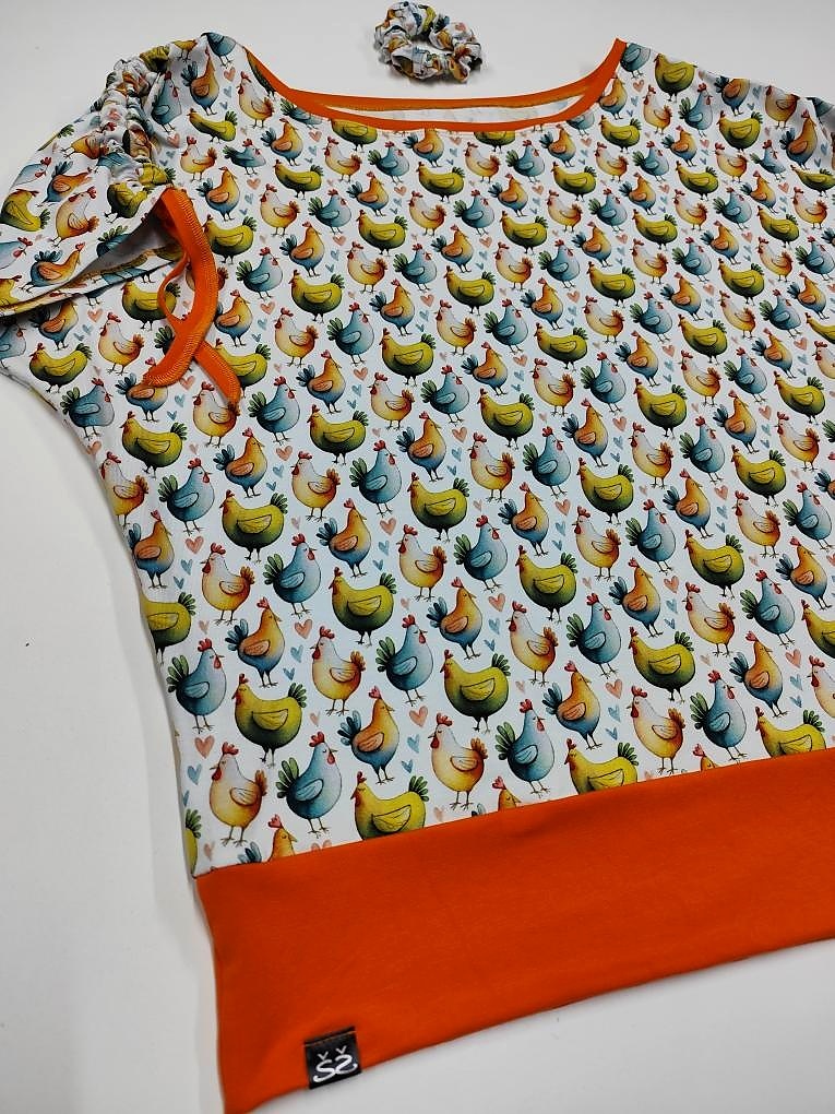 Kombinace barevného tisku slepiček a oranžovou jednobarevkou.