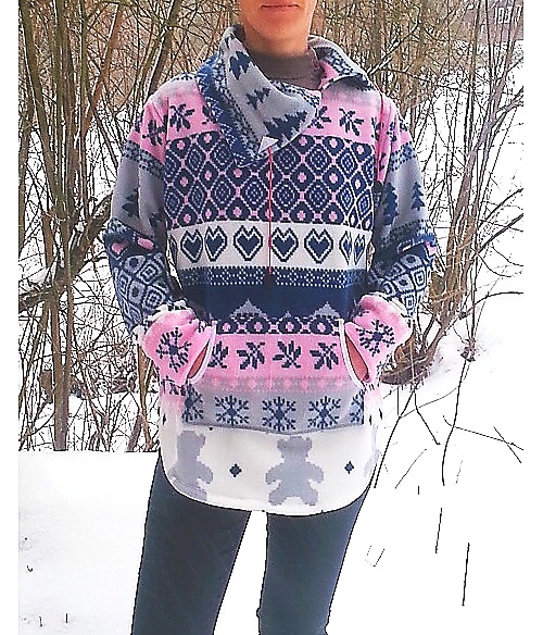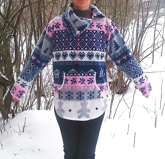 Dámská teplá mikina s kapsou na předním díle a ohrnovacím límcem.