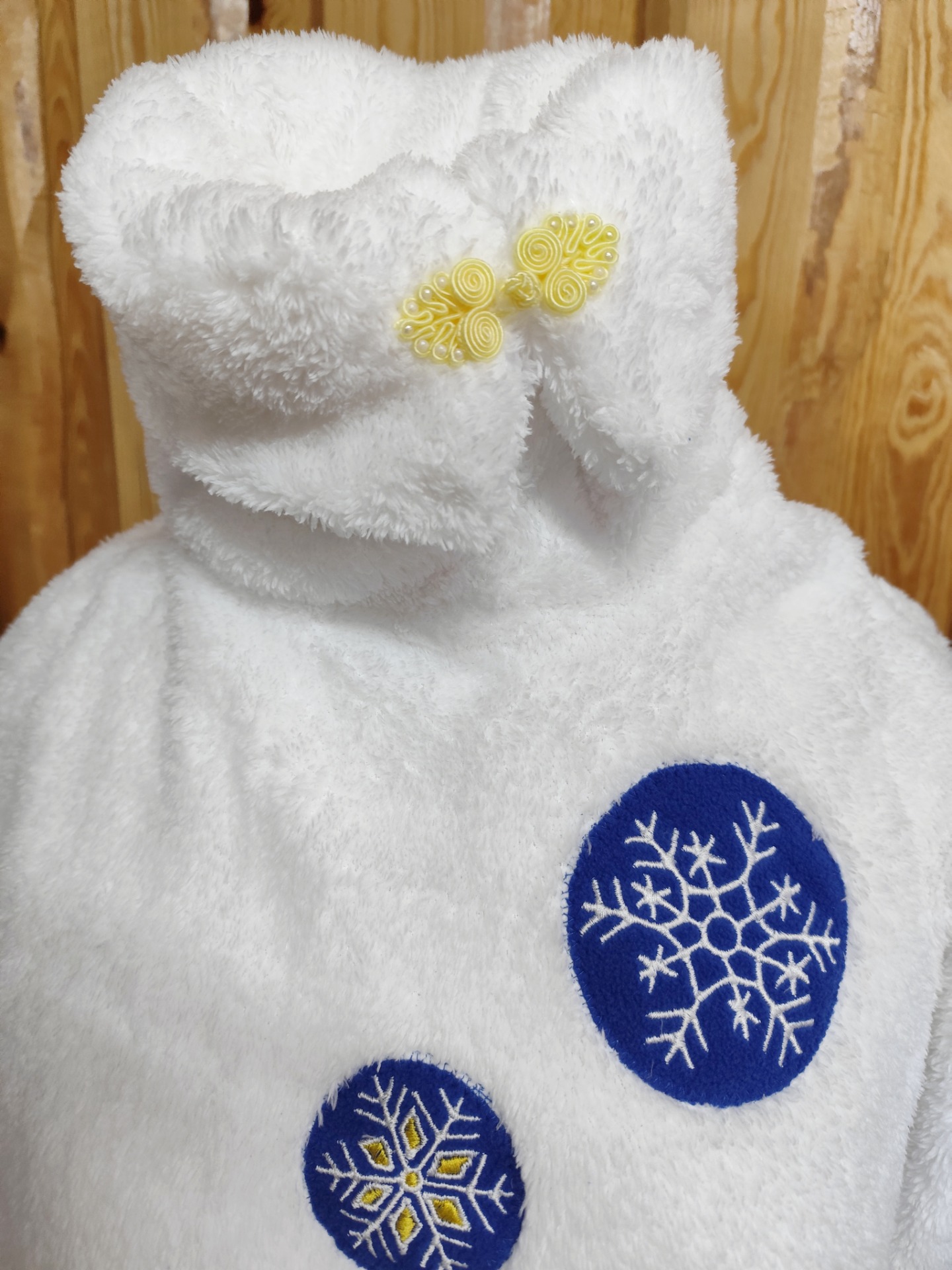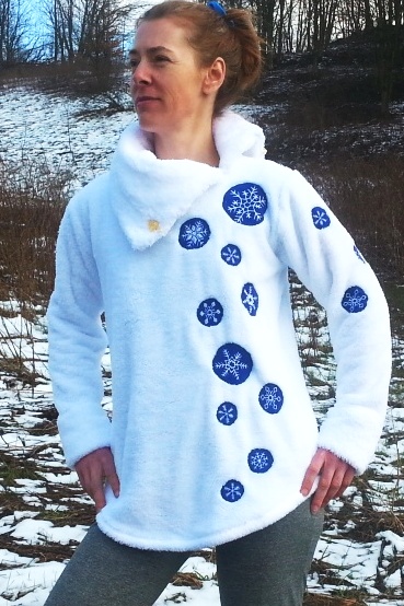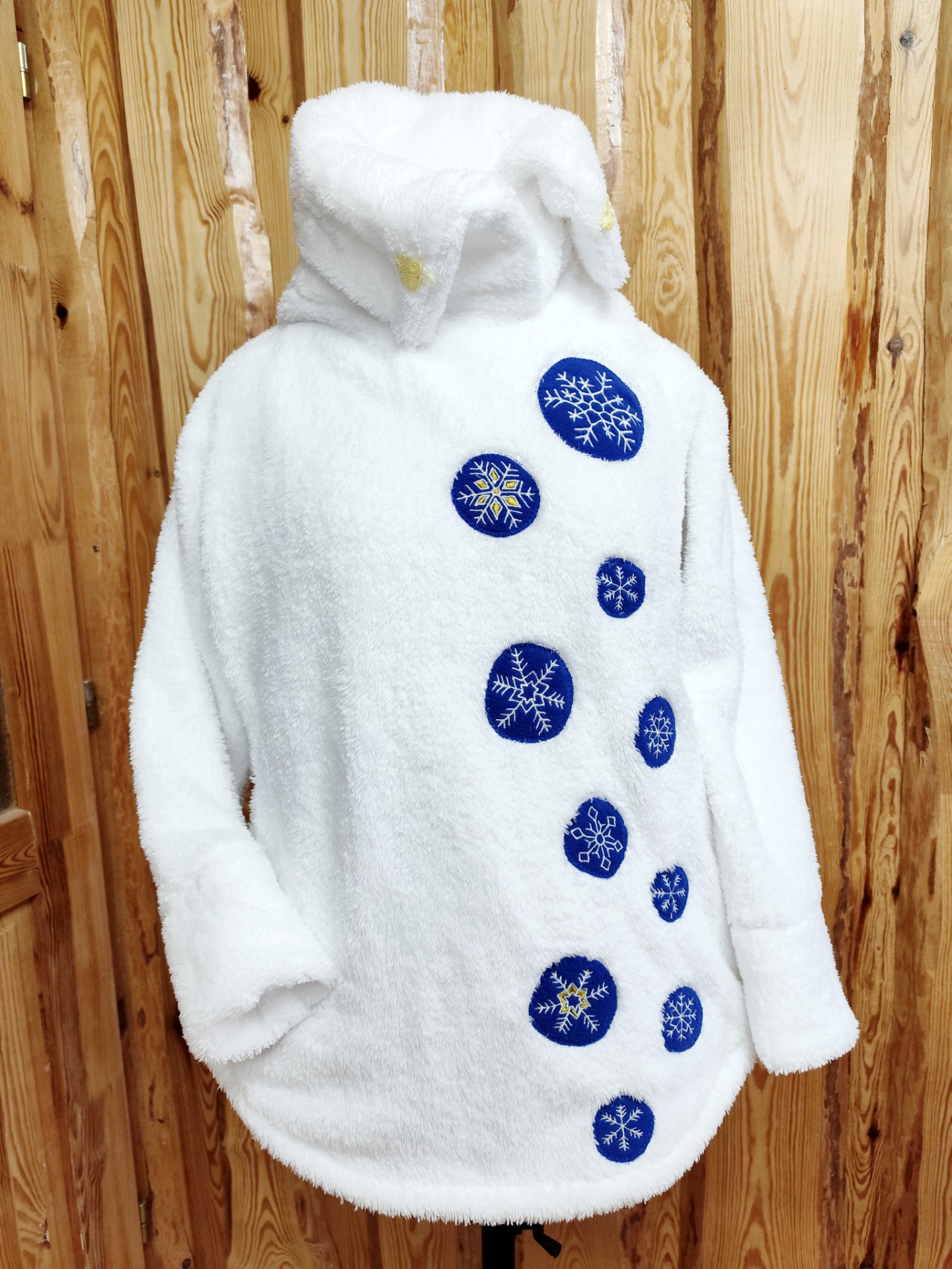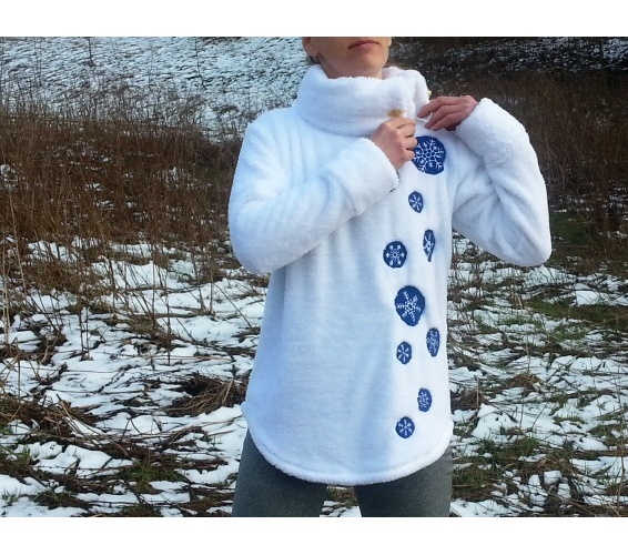 Dámská teplá mikina bílé barvy s vyšívanými vločkami na předním díle, rukávu a části zadního dílu.